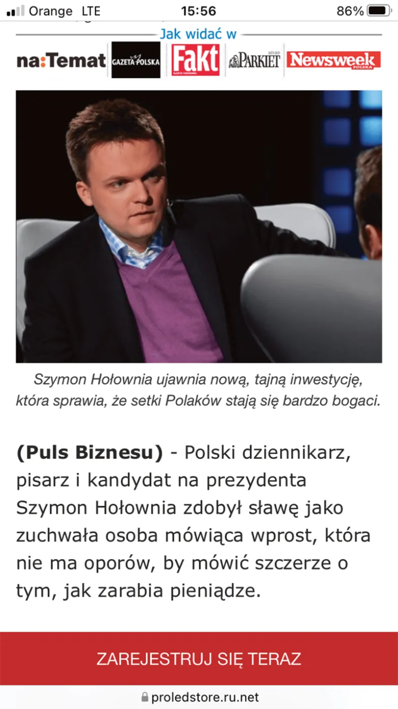 Inwestycyjny scam znalazł swe najszersze ujście w postaci podszywania się pod Orlen, gdyż jest to jedna z największych i najgłośniejszych medialnie polskich firm. I zapewne, choć danych na ten temat nikt nie gromadzi, najwięcej ludzi nabiera się właśnie na biało-czerwone logo z orłem. Nie znaczy to jednak, że tylko skopiowany wizerunek Daniela Obajtka i Wojciecha Jasińskiego jest zagrożeniem dla Polaków pragnących pomnożyć swój majątek. Masowo wykorzystywana jest też postać wspomnianego już Andrzeja Dudy, który nie tylko „zachęca” do inwestowania w Orlen, ale również „prywatnie” reklamuje handel kryptowalutami. I robi to ręka w rękę najczęściej z dwiema innymi postaciami życia politycznego: Szymonem Hołownią i Pawłem Kukizem. Tu stosuje się zazwyczaj formę kuszenia poprzez dostęp do skrzętnie ukrywanej przed maluczkimi tajemnicy. „Mikrofon był jeszcze włączony, gdy Szymon Hołownia ujawnił sekretną możliwość” – czytamy, po czym jesteśmy kierowani do wykresu, który ma pokazać, jak lider Polski 2050 zainwestował w bitcoiny 2,3 mln zł, a dziś ma 5,4 mln. Gdzie indziej czytamy: „Paweł Kukiz wyciągnął swój telefon i pokazał widzom, jak dużo zarabia” albo „Duda wyznał, w jaki sposób pomnożył swój majątek”.